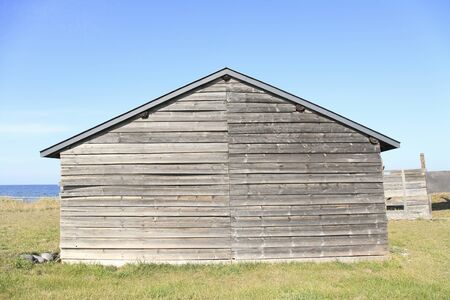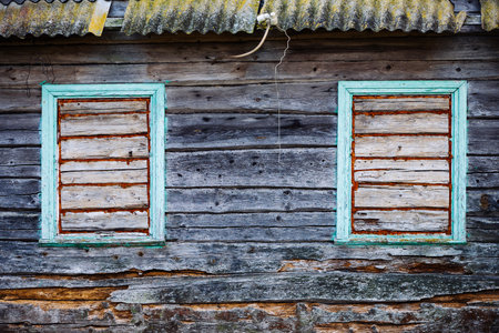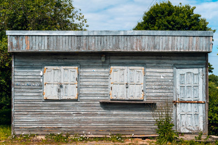 Old wooden house with windows and doors. In the background is a cloudy sky.
