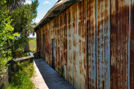 An old rusty tin shed beside a salt marsh in the low country of Georgia, USA.