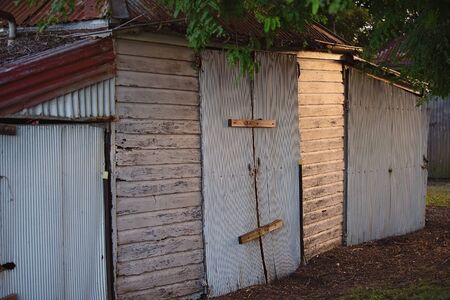 Derelict old country shed ready to fall down, burnished with color by the late afternoon golden sunlight
