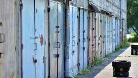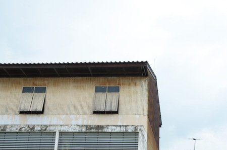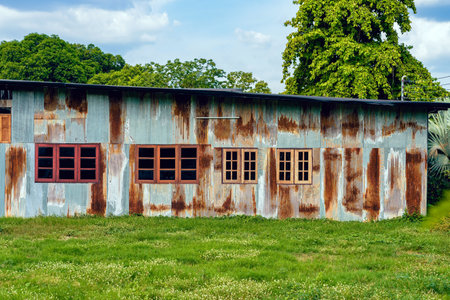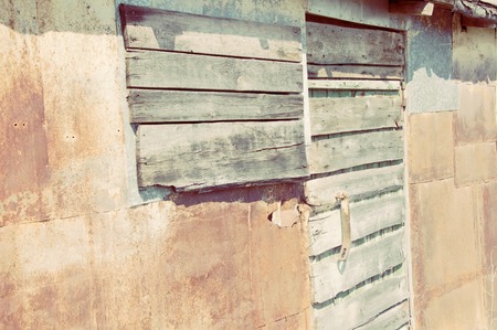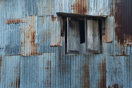 Facade house with old zinc wall. Beautiful vintage galvanized sheet make nice exterior of home. Rusty galvanized iron sheet with materials to make house wall. Corrosion of old rust galvanized sheet.