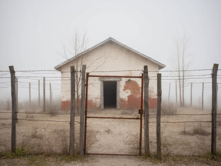 AI Generated. Historical view of a barbed wire fence surrounding a disused building on a foggy day