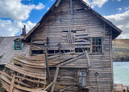 A weathered wooden building with peeling paint stands in a rustic locale, illuminated by bright sunlight, creating a warm and nostalgic atmosphere.