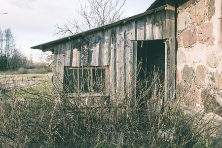 Abandoned ruins of old wooden building in latvia countryside - vintage green look