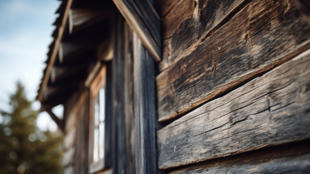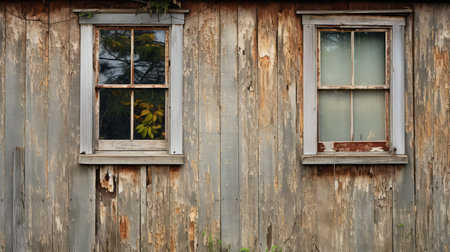 This image showcases a rustic wooden house facade, highlighting the vintage windows with shutters and delicate lace curtains, embodying timeless charm and warmth.