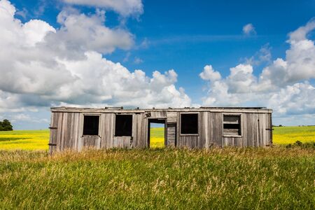 Old Decrepit Boxcar in Canola Field with Blue Sky and Clouds