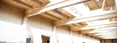 Abandoned building with columns. The gloomy place was empty and dilapidated, windows and doors.