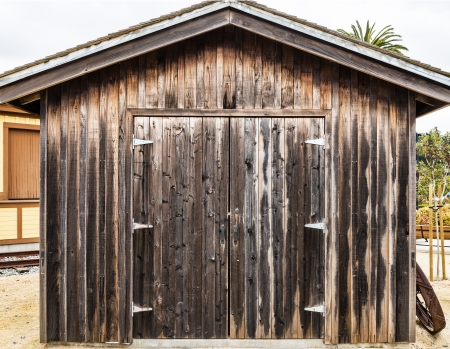 Rustic wooden storage shed painted white on historic Pierce Point Ranch