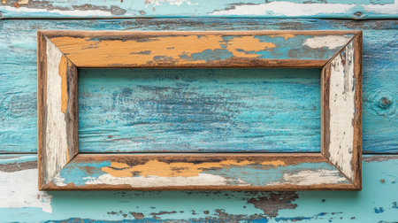 A vintage wooden frame with a charming weathered finish rests on a textured blue and green rustic wooden background, ideal for artistic displays.