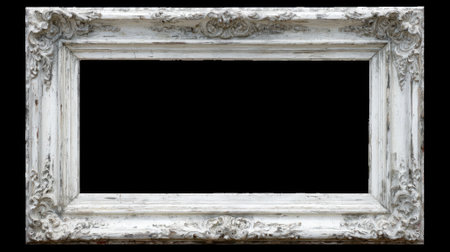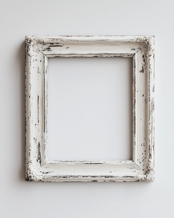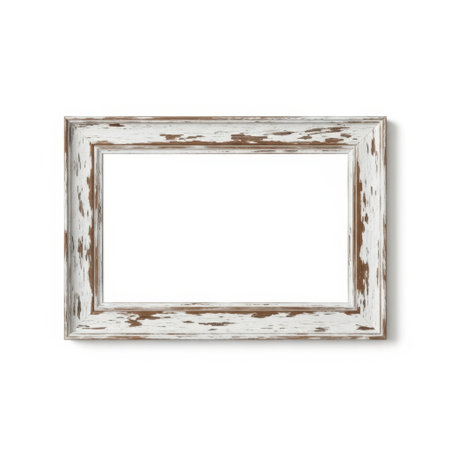 Distressed White Frame - A shabby-chic style picture frame with intentional chipped paint and worn edges, empty against pure white.