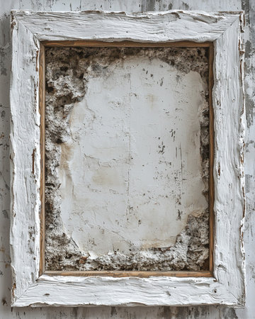 An aged, weathered white picture frame showcasing a rough, textured concrete and plaster interior, evoking a rustic, aged aesthetic.