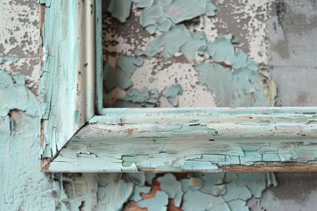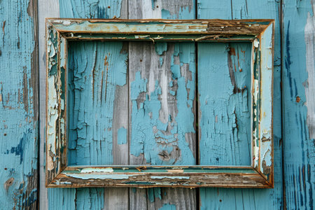 A weathered wooden frame with peeling blue paint sits on a textured blue surface....