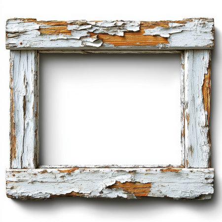 Rustic wooden frame shows signs of wear with peeling paint and exposed wood. It offers a unique backdrop, perfect for showcasing art and personal creativity.