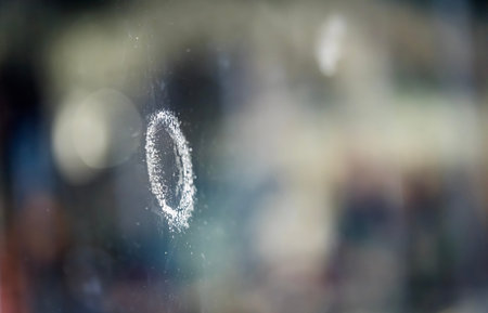A clear glass adorned with water droplets sits elegantly on a reflective surface, against a misty blue backdrop. Ideal for beverage and interior designs.