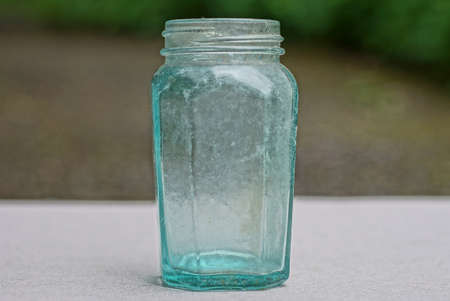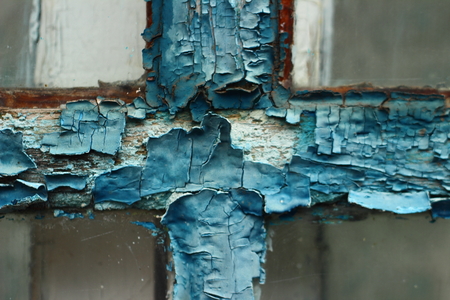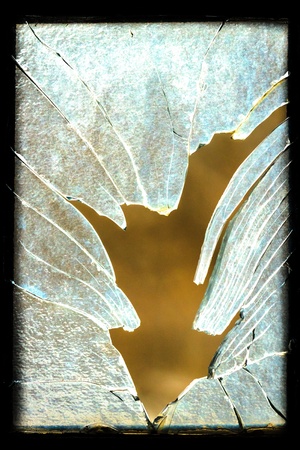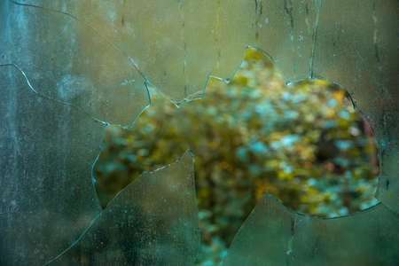 Broken window in an old abandoned house. Shards of broken glass. Green trees outside the window.