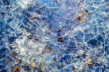 Macro photography of broken glass with sharp edges in blue tones. Abstract composition of shattered glass fragments creates artistic pattern with dramatic lighting.