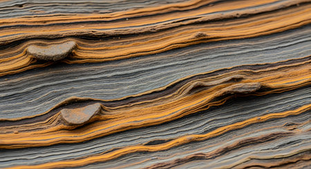 A detailed macro photograph of the surface of a sedimentary rock, showcasing distinct, wavy layers of rusty orange and dark grey. This natural abstract image provides a beautiful texture background representing geology, time, and Earth's history.