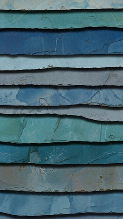 Layers showing overlapping layers of natural slate tiles in varying shades of blue and teal creating a textured horizontal pattern with subtle variations in color...