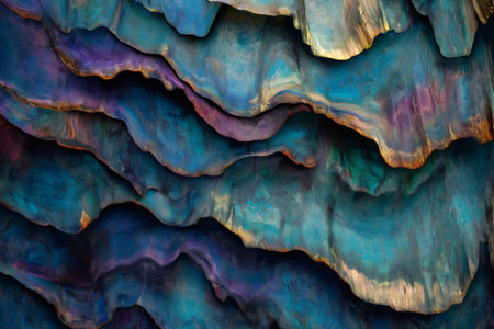 Close up view of tree bark revealing vibrant, layered patterns in shades of blue, purple, and green, creating an abstract natural texture