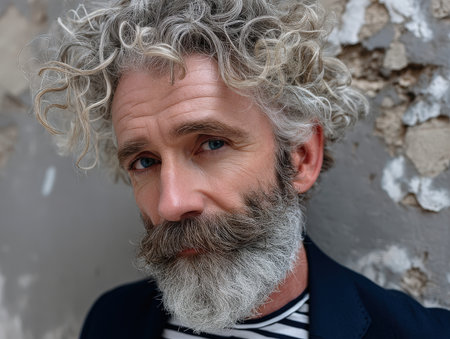 Curly-haired man with a gray beard and mustache looks directly, wearing a striped shirt and dark jacket. Distressed wall background visible. No text is present
