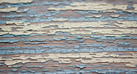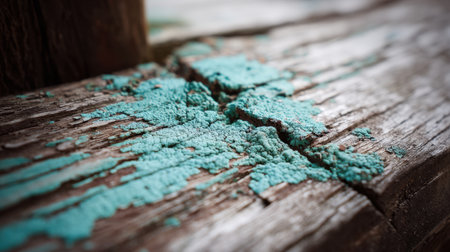 A detailed close-up shot of old, flaking paint on a wooden surface, revealing layers of decay and the rough texture of the material.