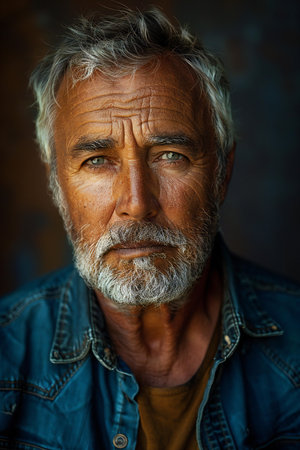 Portrait of an old man with grey beard and mustache in jeans jacket.