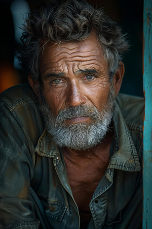 Weathered face of a resilient senior man, eyes reflecting experience, covered in raindrops from harsh conditions, looking out at the sea.