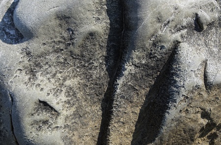 Textured igneous rock with formations and shadows on a rural beach