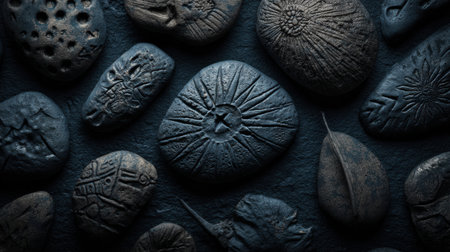 Stones with engraved symbols lay on a dark surface, showing details of erosion and time while highlighting their natural patterns and shapes.