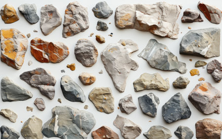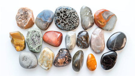 Assortment of natural stones positioned in a cohesive display, isolated on white