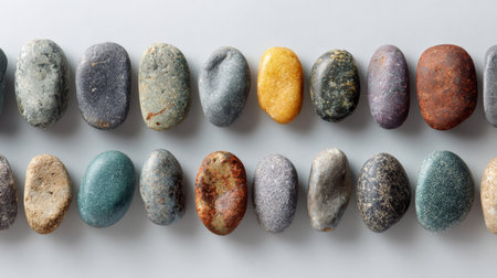Smooth stone pebble rock mineral natural colorful round oval texture pattern arranged in neat rows on white background