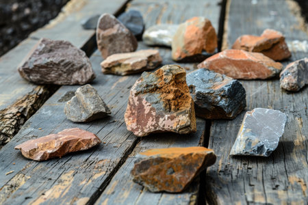 Various rare earth mineral ores are showcased on a rustic wooden table, their diverse raw textures and natural earthy tones. the uneven surface and natural lighting emphasize the unrefined quality of the minerals.