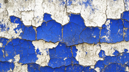 This image showcases a detailed close-up of cracked and peeling blue and white paint on a weathered surface, perfect for artistic projects and backgrounds.