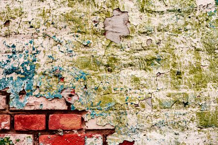 Old grungy red brick wall with peeled white beige stucco background. Vintage retro plaster wall with dirty cracked scratched texture background
