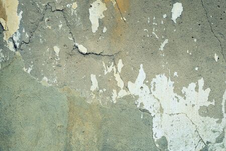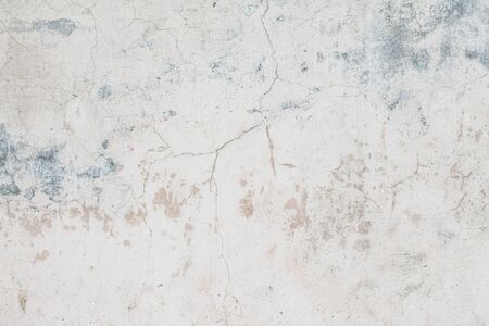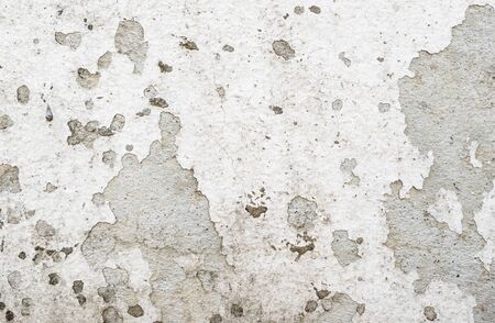 plain old aged white colored painted faded weathered textured pattern on cracked cement concrete house wall surface background. Detailed backdrop, abstract design and structural architecture concept