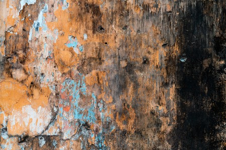 Close up of damaged wall with peeling paint, revealing the texture underneath. The textures and colors create an abstract feel.