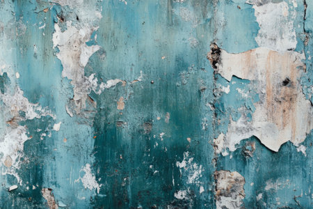 Aged wall with colorful peeling pieces of paint. Abstract wallpaper background. Created with Generative AI