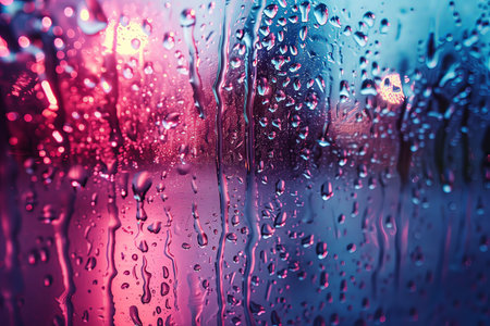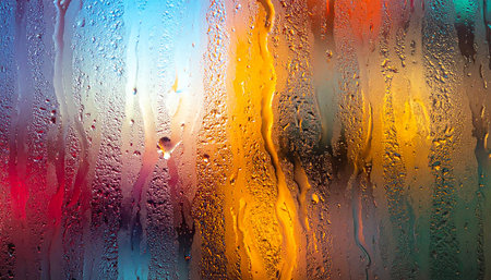 Abstract view of water droplets and streaks on glass, with blurred colorful lights creating a vibrant, textured background.