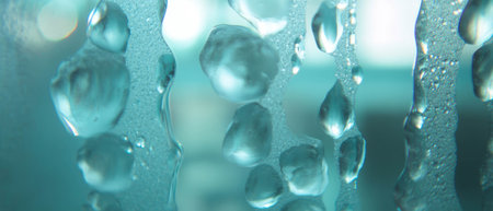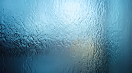 Soft blue textured frosted glass with water droplets and condensation creates a calming atmosphere, perfect for modern interior design and minimalistic styles.