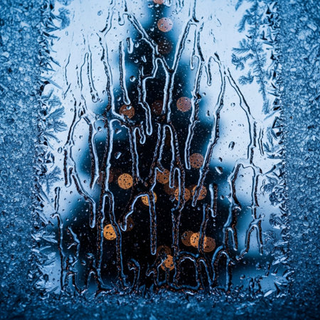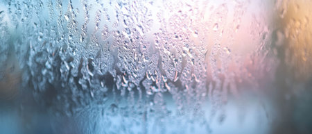Moisture clings to a window as condensation creates an abstract pattern, capturing the transition from night to day with gentle light shining through.