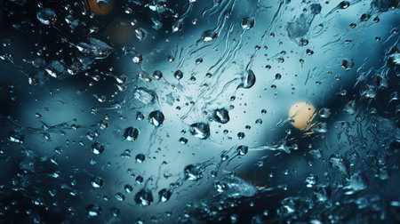 Shattered glass with raindrops, blurred lights in warm tones create a dramatic abstract scene