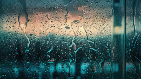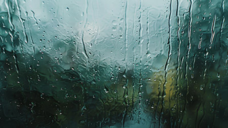 Abstract and intense cinematic view of heavy rain streaks flowing dramatically across a textured win
