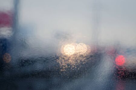 Heavy rain. Raindrop on the window of the car. Abstract blur bokeh of traffic and car light.