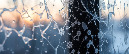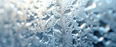 Close-up of frost patterns on glass with soft light in the background, copy space.