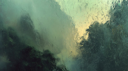 A soothing abstract image showcasing rain-soaked glass with a blurred landscape background, creating a tranquil atmosphere filled with soft hues and textures.