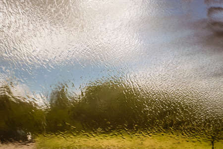 Water on glass with outdoor scenery background. Abstract rain drop on window. Surface level.