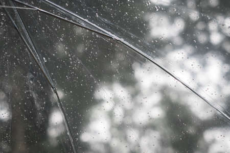 Abstract background. Water drop on the clear umbrella. Green and white bokeh background
