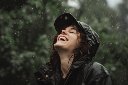 A woman is smiling and laughing while wearing a black raincoat. She is enjoying the rain and the moment