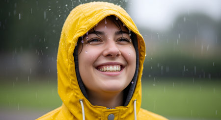 A cheerful young woman wearing a yellow raincoat smiles brightly while looking up into the falling rain. The image captures a moment of joy and appreciation for the weather, with water droplets visible on her hood and face.