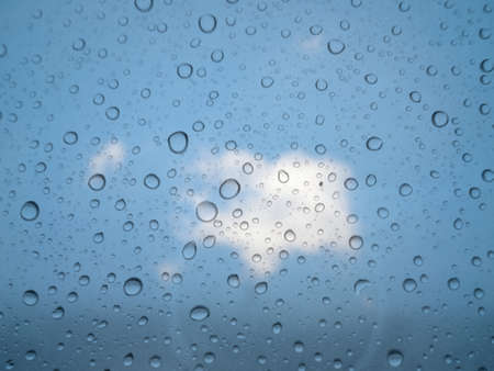 changeable weather concept, raindops on window glass with bokeh of serene blue sky with few clouds