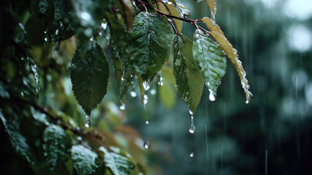Soft rain falling gently, with water droplets forming and slowly dripping. The background is softly blurred with natural, moody atmosphere.